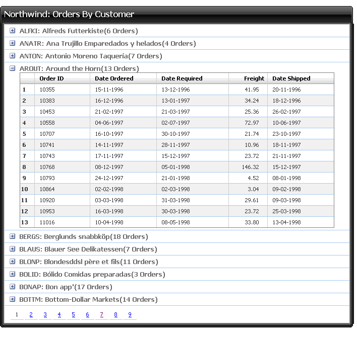 使用northwind的數(shù)據(jù)。點擊前面的加號會把其它屬于這個產(chǎn)品的詳細(xì)訂單展示出來,而每個產(chǎn)品后面都會有它的訂單個數(shù)。點擊'+'后的樣子: