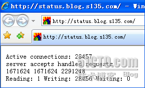 在3萬并發(fā)連接下,訪問Nginx 0.5.33 + PHP 5.2.5 (FastCGI) 服務(wù)器的PHP程序,仍然速度飛快。下圖為Nginx的狀態(tài)監(jiān)控頁面,顯示的活動連接數(shù)為28457(關(guān)于Nginx的監(jiān)控頁配置,會在本文接下來所給出的Nginx配置文件中寫明):