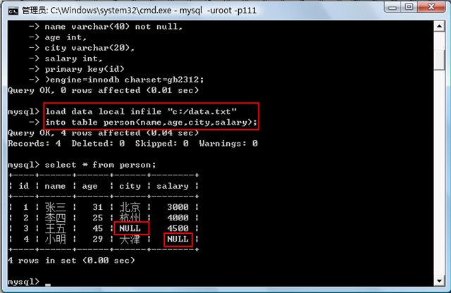 其中l(wèi)ocal表示本地。執(zhí)行后,可以看到NULL數(shù)據(jù)也被正確地導(dǎo)入。