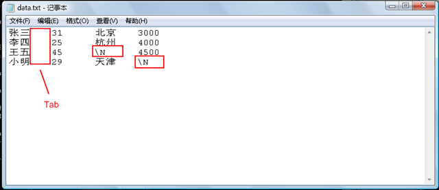每一項之間用Tab鍵進行分隔,如果該字段為NULL,則用\N表示。