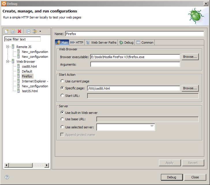選擇你所需要的調(diào)試的html文件,右鍵點擊"Debug As" 下的 “Debug...” ,其中左側(cè)菜單中要選用 “Web Browser”,右側(cè)的"Main" 選項卡中的 "Browser executable"中一定要填寫正確的firefox.exe文件的路徑,其他的默認(rèn)即可,如下圖: