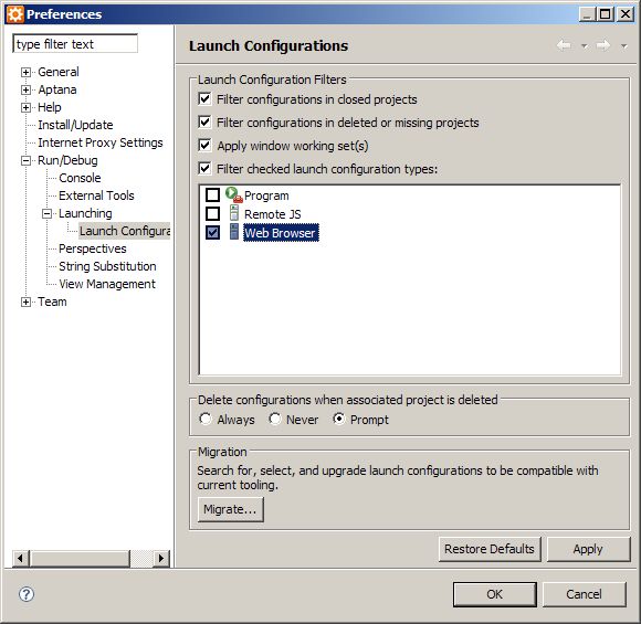 “Window” -> "Preferences" -> "Run/Debug" -> Launching -> Launch Configuration