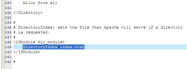 查找關(guān)鍵字,DirectoryIndex(目錄索引,也就是在僅指定目錄的情況下,默認(rèn)顯示的文件名),可以添加很多,系統(tǒng)會(huì)根據(jù)從左至右的順序來優(yōu)先顯示,以單個(gè)半角空格隔開,比如有些網(wǎng)站的首頁是index.htm,就在光標(biāo)那里加上“index.htm”文件名是任意的,不一定非得“index.html”,比如“test.php”等,都可以。