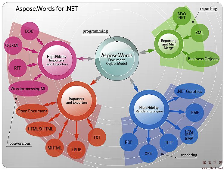 Aspose.Words, 是Aspose“家族類庫”之一。除這個以外,還有其他許多厲害的類庫例如Aspose.pdf(操作PDF文件的類庫)、Aspose.Flash(操作 Flash文件的類庫)、Aspose.report(操作報(bào)表的類庫)等等,大家有興趣的可以上官方網(wǎng)研究下。這些類庫都包含兩種語言,一種是java ,另一種是.NET.這里主要是介紹Aspose.Words for .NET。Aspose.Words for .NET功能非常強(qiáng)大,您不需要安裝office組件,都可以用這個來生成word文檔。Aspose.Words支持 DOC,DOCX,OOXML,RTF格式,HTML格式,OpenDocument格式,PDF格式,和其他格式 。從下面圖中,大家可以更加詳細(xì)的了解Aspose.Words的架構(gòu)。有一點(diǎn)忘了提,這套類庫是收費(fèi)的,在本文后面我會提供一個破解版的下載地址給大家的。