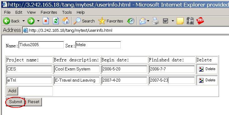 圖三:在添加了兩行數(shù)據(jù)之后,點(diǎn)擊Submit按鈕提交數(shù)據(jù)