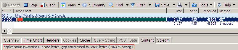 注意看上圖的紅色部分,jquery src文件在啟用gzip后大小減少了70%