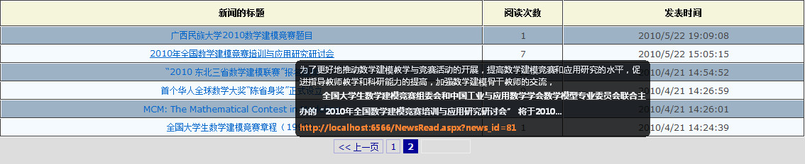4==》預(yù)覽新聞內(nèi)容,在鼠標(biāo)移到連接上面時觸發(fā)事件,得到新聞的id并使用ajax去數(shù)據(jù)庫中查找相應(yīng)的新聞內(nèi)容,截取一部分顯示在div里面,這里有一個要注意的地方,就是如果截取的內(nèi)容里面有html標(biāo)記時要特別注意下。