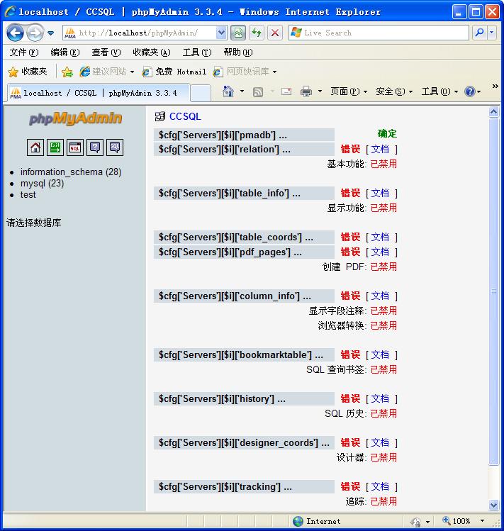之后訪問phpMyAdmin的時候就出錯了。然后把那幾個a去掉,再訪問的時候,除了最后一項tracking,其他都是綠色了。