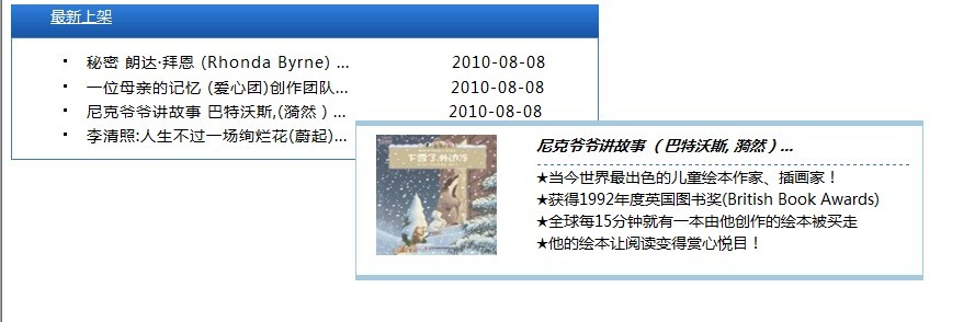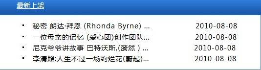 Ben最近在負(fù)責(zé)一個(gè)購書網(wǎng)站,在網(wǎng)站的首頁上,有一個(gè)叫做“最新上架”的板塊,板塊的內(nèi)容比較簡單,只有書籍名稱,作者姓名和上架時(shí)間(如圖),當(dāng)初設(shè)計(jì)的時(shí)候并i沒有過于豐富的構(gòu)思