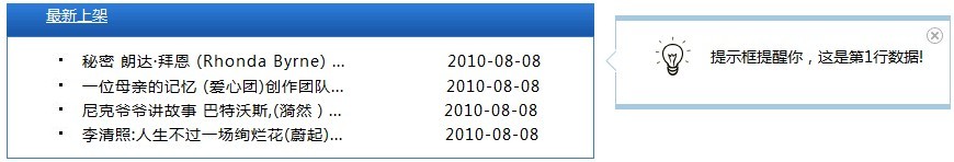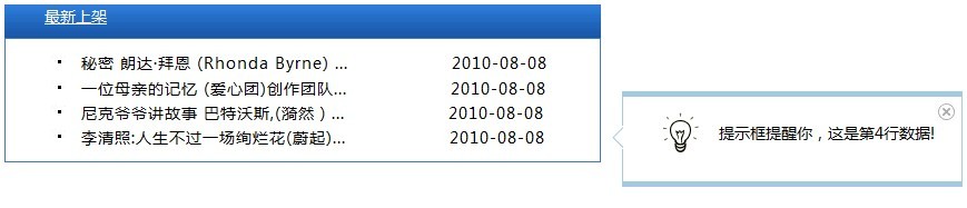 鼠標(biāo)移動到相應(yīng)的數(shù)據(jù)行上面,顯示相應(yīng)的提示框,右邊的打叉小圖標(biāo)用以關(guān)閉整個(gè)彈出層...