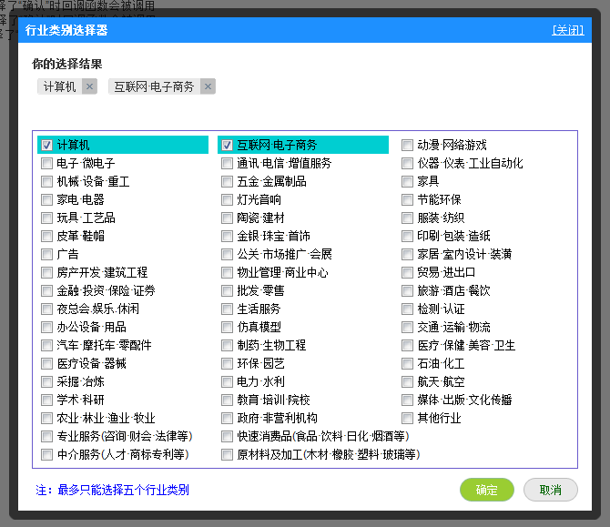 調(diào)用例子:選擇編號為1和2的行業(yè),并且定義選擇器標題為"行業(yè)類別選擇器"