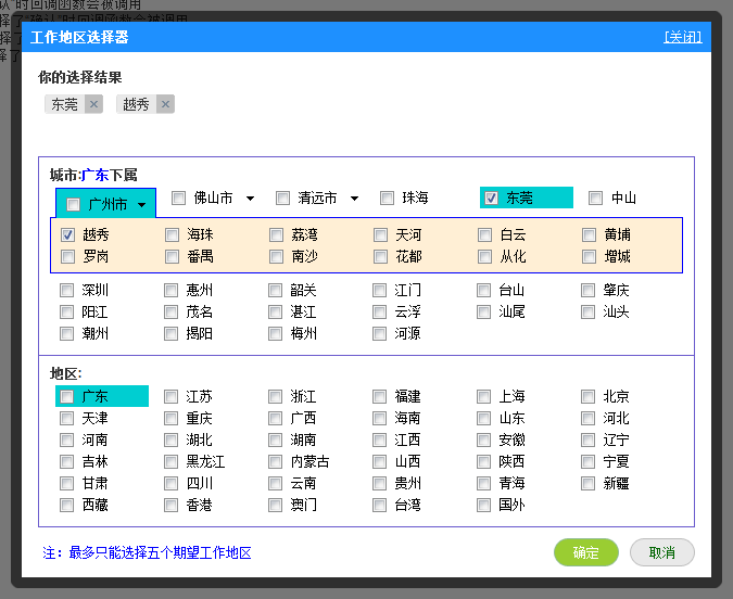 調(diào)用例子:選擇編號為1和2的縣或區(qū),定義選擇器的名稱為工作地區(qū)選擇器