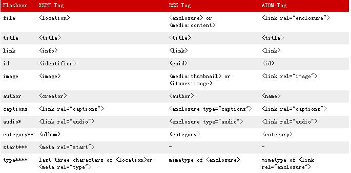 這些參數(shù)可以配置被嵌入到html中的播放器的行為和外觀。如果使用swfobject.js,可以用addVariable()方法來配置,如果使用的embed方式,可以通過定義"flashvars"屬性來配置變量,注意用"&"符號分割這些變量。