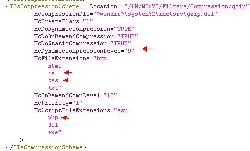 文件路徑:“c:\windows\system32\inetsrv\”(請(qǐng)先備份至他處),打開后搜索“HcDynamicCompressionLevel”,并修改(確定已備份)“Compression/deflate”和“Compression/gzip”兩個(gè)片段的內(nèi)容。下面的圖n圖b所修改的內(nèi)容用意是將js、css和php加入到壓縮的范疇,數(shù)字9代表壓縮等級(jí)。