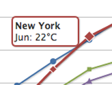 On hovering the chart Highcharts can display a tooltip text with information on each point and series. The tooltip follows as the user moves the mouse over the graph, and great efforts have been taken to make it stick to the nearest point as well as making it easy to read a point that is below another point.