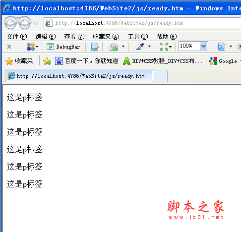在dom加載完成后為每一個p元素動態(tài)的添加了文本,首先$("p")獲取p標簽的集合,相當于Javascript中的 document.getElementByTagName只是這里得到的是Jquery對象的數(shù)組,這樣就有了Jquery固有的隱式迭代的功能,后面的text("這是p標簽")的操作就迭代到了每一個P標簽上,我們也可以顯示的調(diào)用each函數(shù)來顯示的迭代獲得的Jquery對象數(shù)組,下面的代碼同樣可以實現(xiàn)上面的效果: