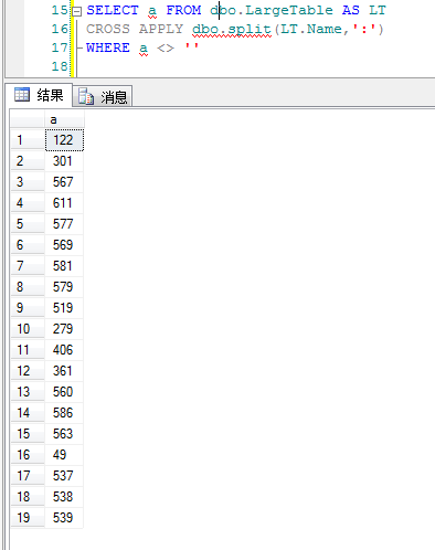 CROSS APPLY dbo.split(LT.Name,':') --自定義表值函數(shù),處理以某個字符分隔的數(shù)據(jù),把這些數(shù)據(jù),返回一張表