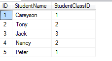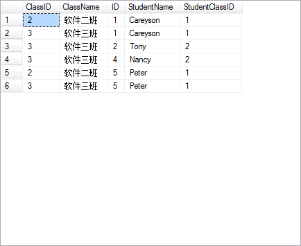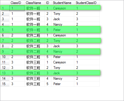 然后通過on后面的限制條件,只選擇那些StudentClassID和ClassID相等的列(上圖中劃了綠色的部分),最終,得到選擇后的表的子集