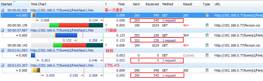 | F5 | 刷新,對Last-Modified有效,它是讓服務(wù)器判斷是否需要讀取緩存,所以,依然存在請求和返回?cái)?shù)據(jù),我們可以看到,分別是352和239。狀態(tài)碼是304。 |