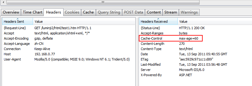我在這里將過期時(shí)間設(shè)置為1分鐘,然后,我們通過HttpWatch觀察IE請求該頁面(第一次請求),得到的HTTP頭如下:
