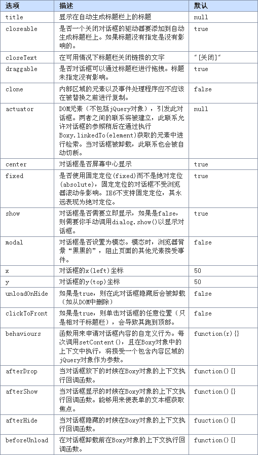 構造函數(shù);創(chuàng)建一個新的boxy對話框。element是對話框的內(nèi)容;任何有效的參數(shù),jQuery的$()函數(shù)在這里也是有效的。options是一個配置選項的散列,見下面詳細的資料。