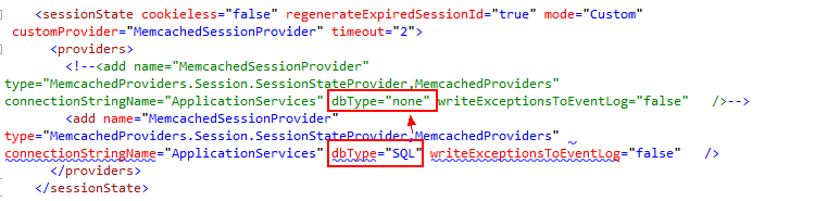 我使用的Memcached客戶端是Memcached Providers,下載完畢后,你會發(fā)現(xiàn)Memcached Providers已經(jīng)提供了對分布式Session的支持功能。如果你還不會使用Memcached Providers,請參考此文Memcached Tip 1:使用Memcached Providers。Memcached Providers提供的示例是直接將SESSION存儲在數(shù)據(jù)庫,我們可以通過配置來將SESSION支持存儲在分布式SESSION的內(nèi)存中,即,將下文中的dbType由SQL修改為none。:
