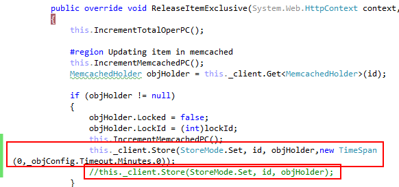 在當(dāng)前的Memcached Providers(1.2版本)中關(guān)于SessionStateProvider(29520-TRUNK)是有一個BUG(我已提交到 codeplex,相信他們的下一個版本應(yīng)該能得到修正)的。如果我們測試SESSION失效時間,發(fā)現(xiàn)只要經(jīng)過一次刷新后,就永遠(yuǎn)是20分鐘(即默認(rèn))。這源于在ReleaseItemExclusive這個重載方法中(該方法用于釋放對會話數(shù)據(jù)存儲區(qū)中項的鎖定),對于Session的重新存儲沒有加上過期時間,如下: