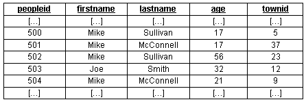 這個(gè)數(shù)據(jù)片段中有四個(gè)名字為“Mikes”的人(其中兩個(gè)姓Sullivans,兩個(gè)姓McConnells),有兩個(gè)年齡為17歲的人,還有一個(gè)名字與眾不同的Joe Smith。