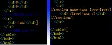下面就深入到測試中來。先看看兩種模板文件的語法:藍條左邊是PHPLIB template的模板,右邊屬于SMARTY。個人偏好是不一樣的,所以這里不作評論。著重對比一下腳本里的處理語句,先看PHPLIB template的: