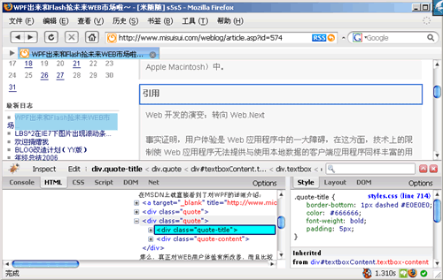 怎么說呢,強就一個字啦~NND,上面這個圖是我開到了 Ispect 狀態(tài),鼠標移動時截下來的。這比看源文件然后再搜索可是方便的太多了,這個世界是怎么了,還有這樣的雷峰存在,真是太BT了~