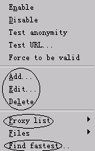 2、 可一次設(shè)置多個代理地址,如可一次加入20~30個,甚至更多的代理地址,這些代理地址可同時發(fā)揮作用。我比較懶,只設(shè)了8個,從來沒出現(xiàn)過不能訪問站點(diǎn)的情況。道理很簡單---設(shè)了那么多代理,總有幾個是可用的,同時失靈的概率恐怕為零吧!