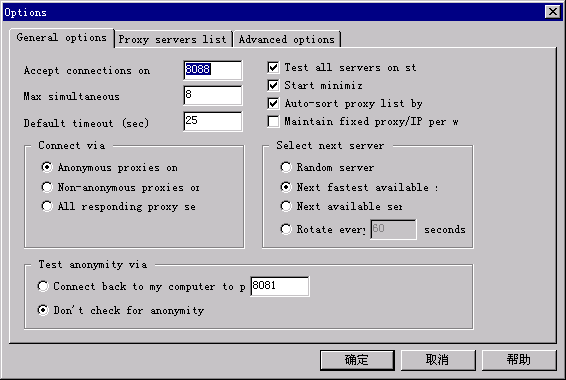 Option對話框中集成了軟件的主要功能,可根據(jù)需要進(jìn)行有關(guān)選項(xiàng)設(shè)置。分為三種類型:一般選項(xiàng)、代理服務(wù)器列表及高級選項(xiàng)。