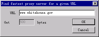 在菜單中選取此命令,彈出以下對話框,在URL編輯框中輸入一網(wǎng)址,可檢測出訪問此網(wǎng)址的最快的代理。