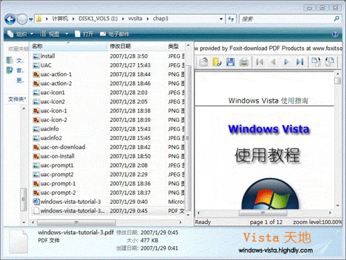 另外需要指出的是,該工具對中文PDF文件的支持不存在任何問題。下圖即為Vista天地網(wǎng)站的Windows Vista使用教程第三章PDF文件的預覽,可以看到該PDF文檔的內(nèi)容包括其中的圖片、漢字均能夠正確顯示。
