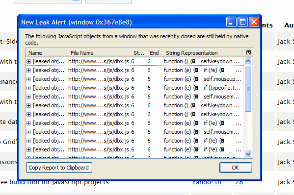 這是個(gè)方便的FireFox擴(kuò)展,當(dāng)你離開那頁的時(shí)候它便會(huì)指向JavsScript對象,如果出現(xiàn)泄漏的話會(huì)彈出一個(gè)窗口顯示細(xì)節(jié)內(nèi)容,而且能夠告訴你是那個(gè)對象或函數(shù)引起的泄漏。