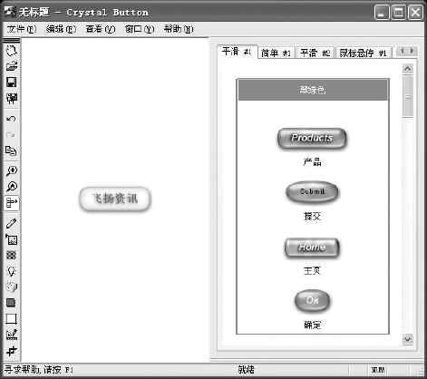 第一步:啟動(dòng)程序,界面左邊是常用的工具欄,右邊是按鈕模板,中間是按鈕預(yù)覽區(qū)。該程序提供的模板有四類共84種按鈕,你可以選擇任意一種你喜歡的按鈕,利用工具欄中的按鈕設(shè)置工具對(duì)按鈕進(jìn)行文字、大小、紋理、燈光和材質(zhì)等調(diào)整。