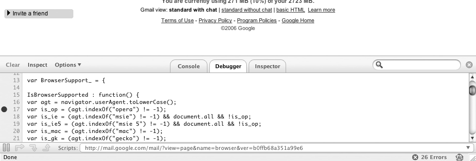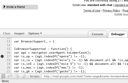 在第四章,你將會(huì)看到一些可用來(lái)形成良好的測(cè)試/使用框架的不同工具,以及對(duì)復(fù)雜應(yīng)用程序的簡(jiǎn)單調(diào)試。用于Firefox的插件Firebug就是其中一例。Firebug提供了許多的有用的工具,如錯(cuò)誤控制臺(tái),HTTP請(qǐng)求日志,調(diào)試,以及元素查看。圖1-1展示了Firebug調(diào)試一段代碼時(shí)的實(shí)況截屏。