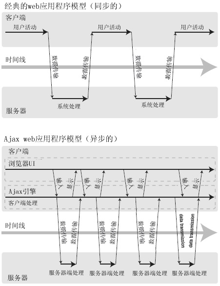 圖1-3:來自文章"Ajax:Web應(yīng)用程序的新途徑"的圖示,展示發(fā)生于客戶和服務(wù)器之間的先進(jìn)的異步的交互