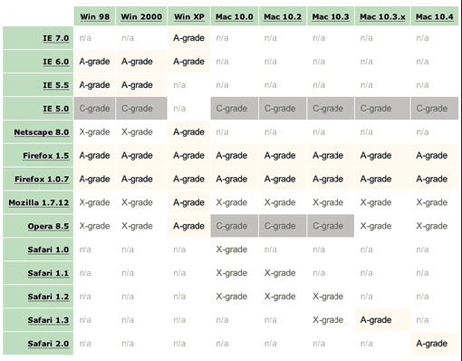 Yahoo開發(fā)了一個(gè)分級(jí)的瀏覽器支持策略,對(duì)瀏覽器指定特定的級(jí)別并依據(jù)其功能為它提供不同的內(nèi)容。Yahoo給瀏覽器三個(gè)級(jí)別:A,X和C: