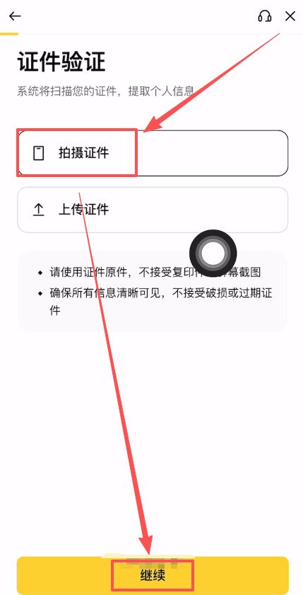 3上傳證件:選擇“拍攝證件”,依次拍攝身份證的正面和反面并上傳。
