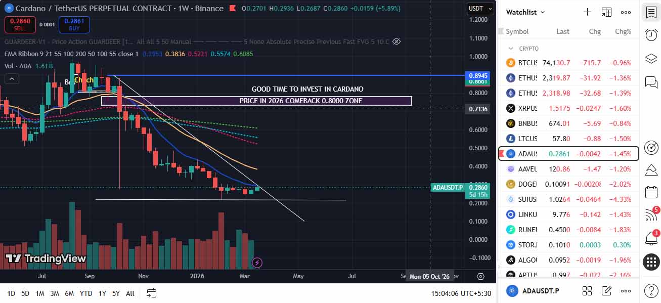 截至2026年3月, Cardano的 交易價格約為0.26-0.28美元,此前在2021年牛市突破3美元高點后經(jīng)歷了一段較長的盤整期。加密貨幣市場已將投機熱潮轉向網(wǎng)絡實用性和機構集成,而Cardano今年正處于技術和治理的關鍵十字路口。