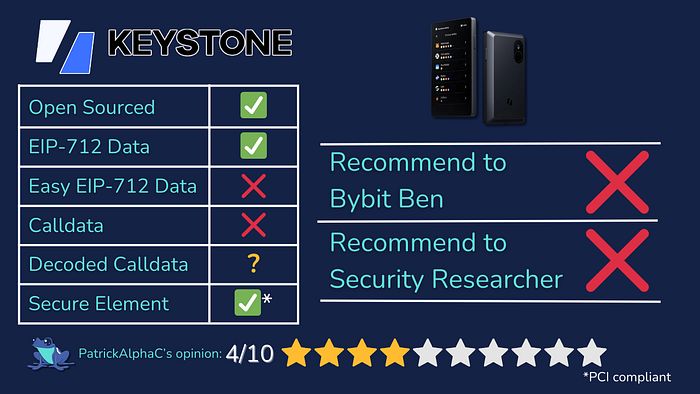 Keystone Pro起步時表現(xiàn)良好,但最終沒能達(dá)到要求。雖然它適當(dāng)?shù)仫@示EIP-712簽名數(shù)據(jù),但其調(diào)用數(shù)據(jù)的解碼不可靠且不一致。錢包雖然嘗試解碼調(diào)用數(shù)據(jù),但往往顯示不正確或不完整的信息,這可能會比根本不解碼還要糟糕。沒有查看原始調(diào)用數(shù)據(jù)的后備選項(xiàng)。
