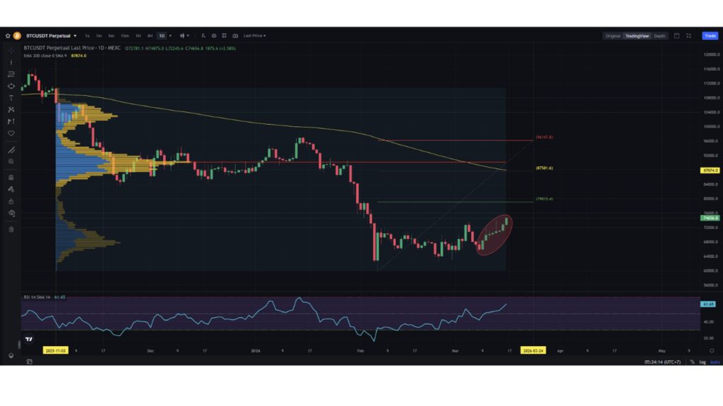 由于比特幣價格徘徊在 74,000 美元附近,現(xiàn)在人們的注意力集中在72,000 美元至 75,000 美元區(qū)間,該區(qū)間已成為決定市場走向的關鍵戰(zhàn)場。