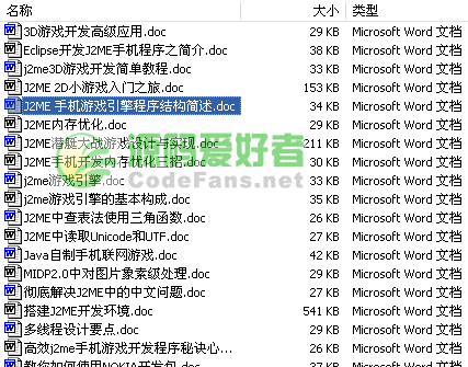 j2me游戲開發(fā)教程合集,很經(jīng)典的教程,全部是講解J2ME手機(jī)游戲開發(fā)的,DOC格式,列表下目錄: