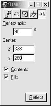 3、選中第二個橢圓,點擊“Edit/Clone”命令,再復(fù)制一個橢圓即第三個橢圓,選中第三個橢圓,單擊Transform面板上的[Reflect]圖標(biāo),其面板設(shè)置如圖4所示。(注意:其中的Center中的x、y值依據(jù)第一個橢圓和第二個橢圓的相交處的位置而定)。