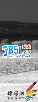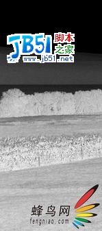 更激進(jìn)一點(diǎn),我將一個極陡的曲線應(yīng)用原始B通道的一個新拷貝上,這幾乎使所有草過曝為白色,整個背景幾乎都變?yōu)楹谏?。惟一還保持灰色的區(qū)域是那些樹、葡萄藤和有限的草。將該結(jié)果載入為圖層蒙版創(chuàng)建出圖9-13D所示的效果,其中的校正絕大部分應(yīng)用于下半部分,上半部分基本沒有變化。