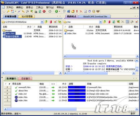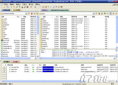 當(dāng)指定站點(diǎn)遠(yuǎn)程服務(wù)器連接成功后,左側(cè)窗口會(huì)自動(dòng)切換到“本地驅(qū)動(dòng)器”標(biāo)簽,并且定位到設(shè)置的本地文件夾,右側(cè)窗口中則顯示已連接的遠(yuǎn)程目錄。在CuteFTP中上傳、下載是件很輕松的事情,同系統(tǒng)資源管理器中一樣,采用了拖拽的方式復(fù)制文件。簡(jiǎn)單說(shuō),選擇文件后,用鼠標(biāo)將左側(cè)本地文件拖到右側(cè)遠(yuǎn)程目錄中即為上傳,反之,則是下載文件,如圖5。