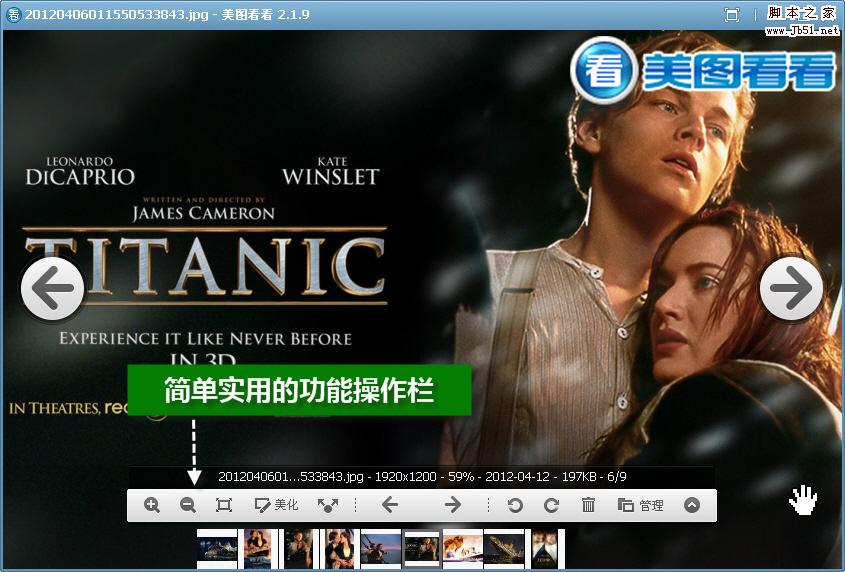 美圖看看為用戶準(zhǔn)備了一個很實用的功能按鈕欄,在其中可以實現(xiàn)圖片縮放、圖片網(wǎng)絡(luò)分享、圖片切換、角度旋轉(zhuǎn)等操作;當(dāng)鼠標(biāo)移動到看圖窗口下部區(qū)域時,還有懸浮的瀏覽切換按鈕出現(xiàn),如圖02所示。而且,軟件還會一并將當(dāng)前瀏覽圖片的詳細(xì)信息顯示出來,比如分辨率、文件大小等等,非常人性化。