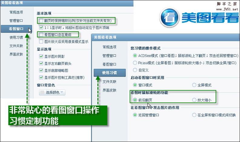 美圖看看在滿足用戶需要的同時,還提供了對看圖操作習(xí)慣的自定義功能。比如,我們可以定義讓看圖窗口總在最前,這樣其他操作都不會打擾到我們流暢看圖;也可以將看圖時鼠標(biāo)滾輪的功能設(shè)置為前后翻頁,這可能更適合一些之前使用ACDSee的用戶,如圖04所示。為用戶提供操作自定義,這讓美圖看看這款小巧的看圖軟件充滿了個性,同時也更符合我們的使用實際。