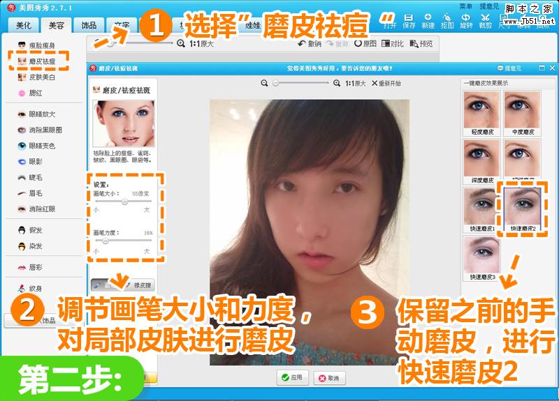 2、點(diǎn)擊“磨皮祛痘”,選擇適合的大小和力度涂抹皮膚不均勻的部分,然后保留之前的手動(dòng)磨皮,再選擇“快速磨皮2”,使皮膚看起來光滑細(xì)膩。